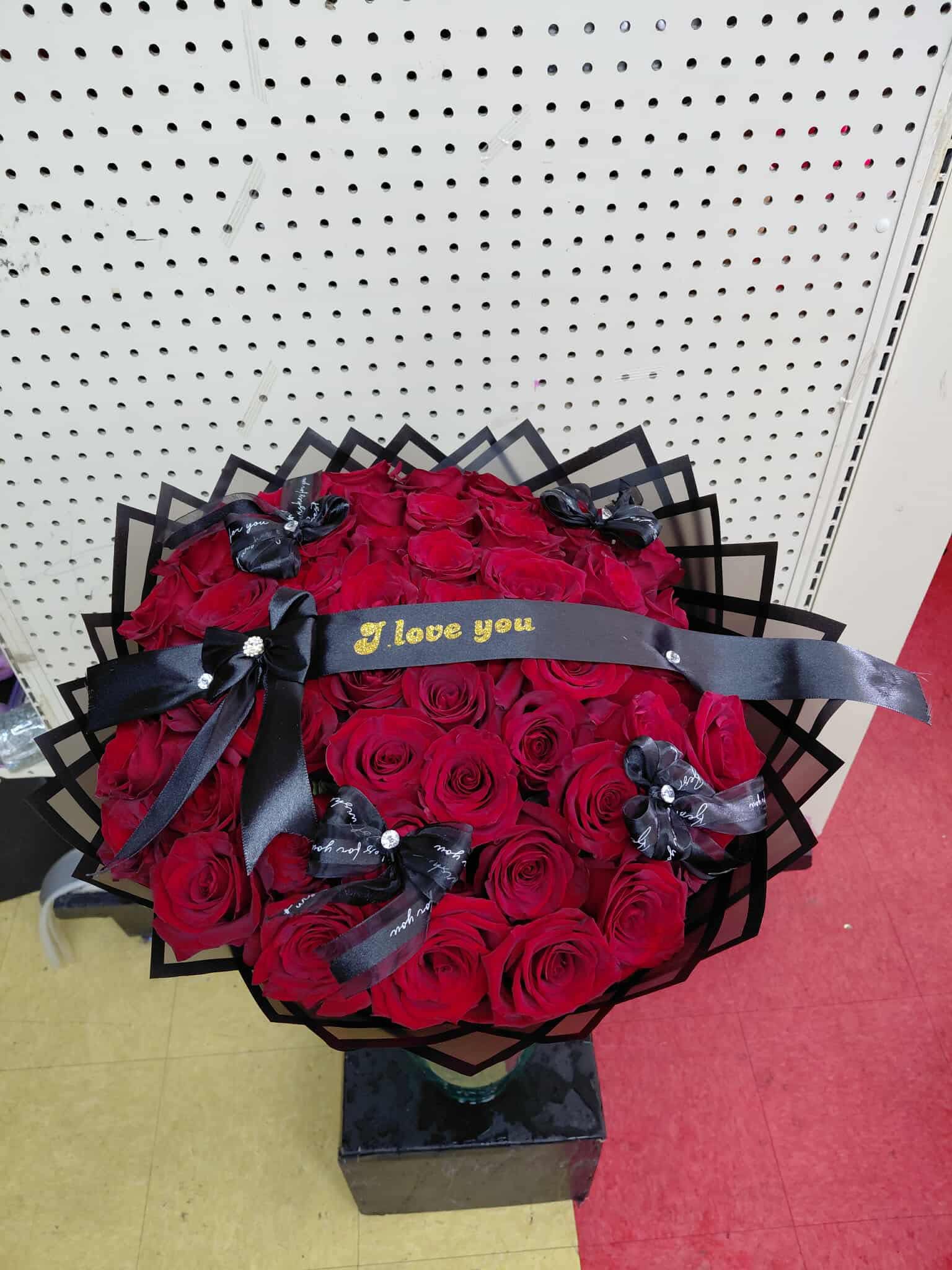 Ramo buchón de 50 Rosas Rojas con Listón negro Papel negro